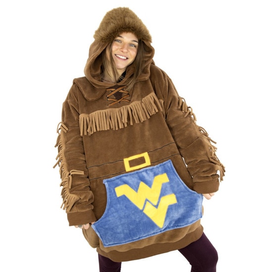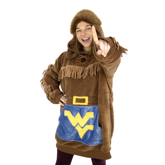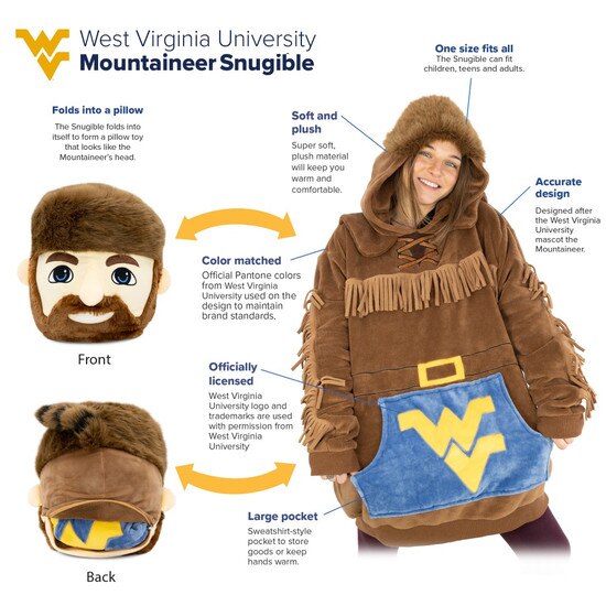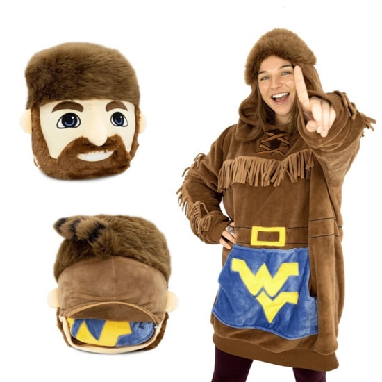 - Two Products in One - This wearable, oversized hooded sweatshirt transforms into a cuddy pillow featuring the head of the Mountaineer decorative storage